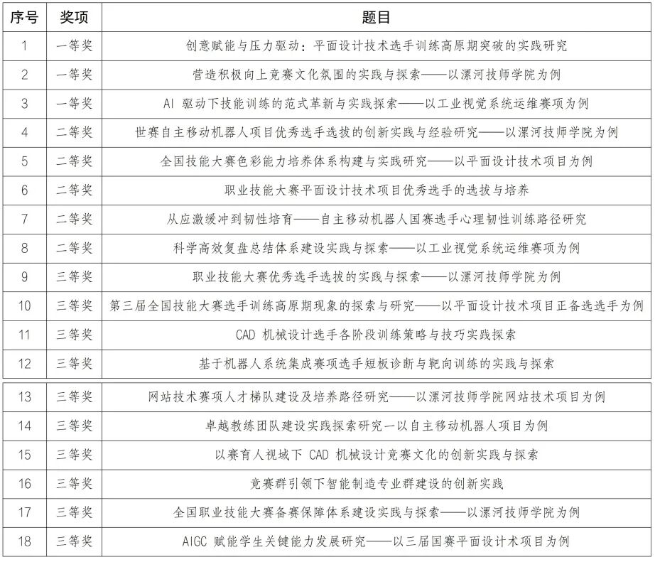此次获奖成果紧扣竞赛实际,突出问题导向与实践转化。其中,《创意赋能与压力驱动:平面设计技术选手训练高原期突破的实践研究》《营造积极向上竞赛文化氛围的实践与探索——以漯河技师学院为例》《AI驱动下技能训练的范式革新与实践探索——以工业视觉系统运维赛项为例》三项成果,聚焦国赛选手成长路径、训练瓶颈突破、智能技术赋能等关键环节,形成了可复制、可推广的训练模式与培养体系,荣获一等奖,成为此次评选的亮眼之作。