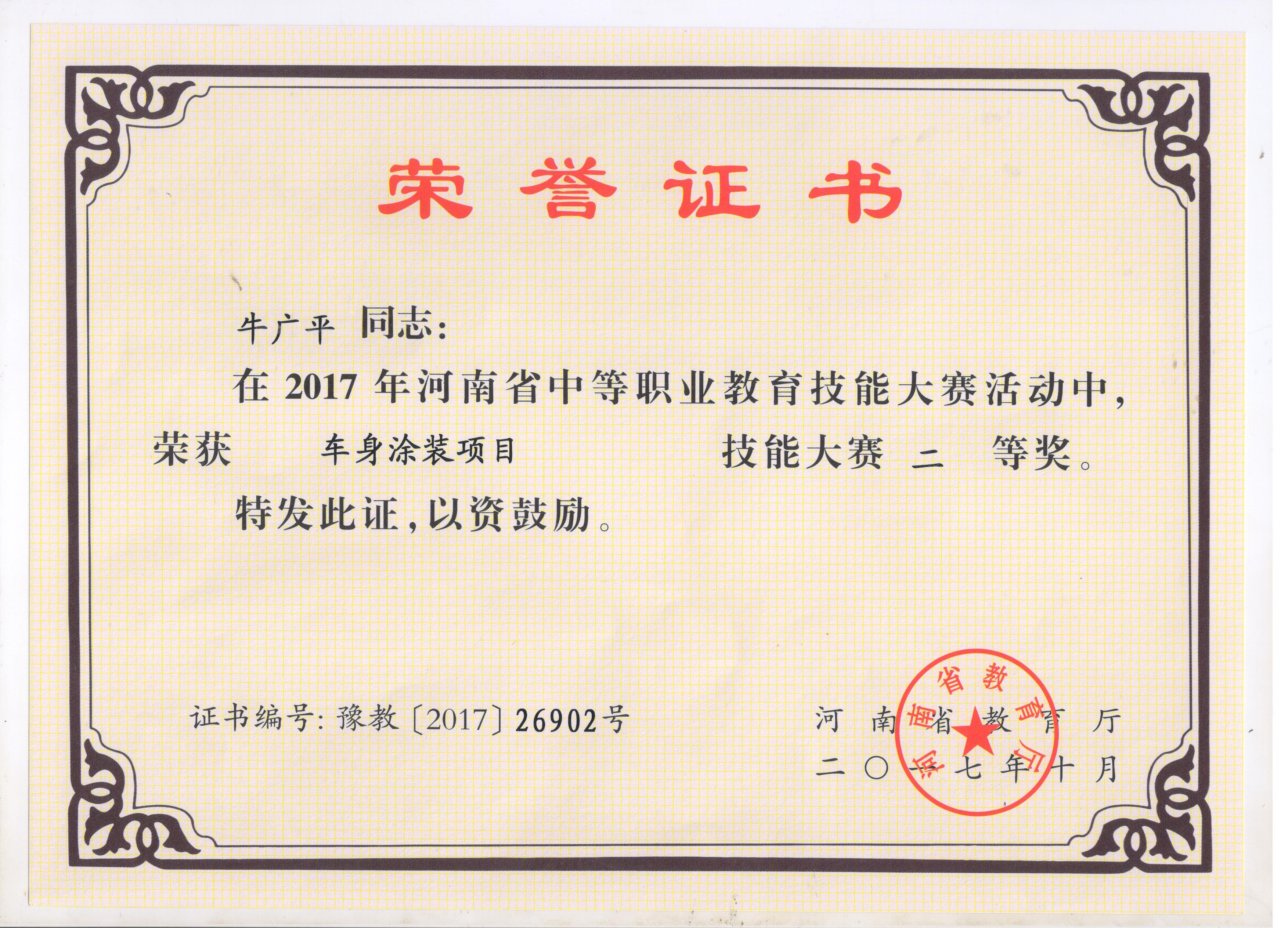 牛广平老师获得省中等职业教育技能大赛《车身涂装项目》二等奖