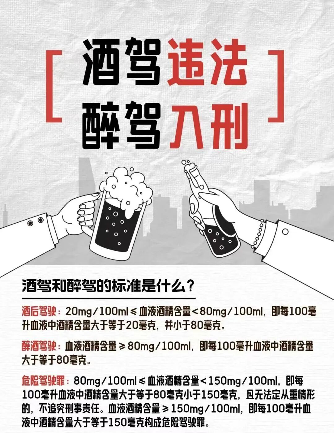 2024年3月1日实施了酒驾最新检验标准,将饮酒驾驶的上限从50mg/100ml降到了20mg/100ml。也就是说,只要驾驶员血液中乙醇含量≥20mg/100ml,就属于违法行为。驾驶员血液中乙醇含量≥80mg/100ml,认定为醉酒驾驶。